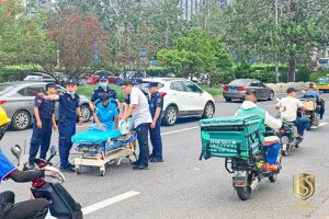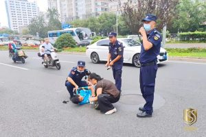 7月27日午后,京城安保駐垂楊柳醫(yī)院項目安保隊員在東門執(zhí)勤時,發(fā)現(xiàn)一名外賣員在騎行中身體搖晃,隨即暈厥倒地。情況緊急,他立刻上前查看外賣員狀況并用對講機通知安保隊長。